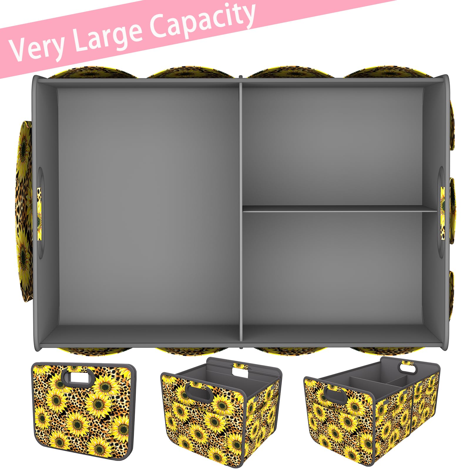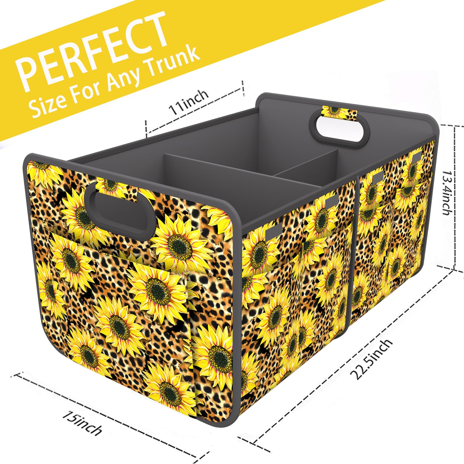 Homeve Trunk Organizer, Car Storage, Reinforced Handles, Collapsible Multi-Compartment, Foldable, Waterproof, Sturdy, 600D Oxford Polyester For Car, SUV, Mini-Van, Sunflower Leopard Print