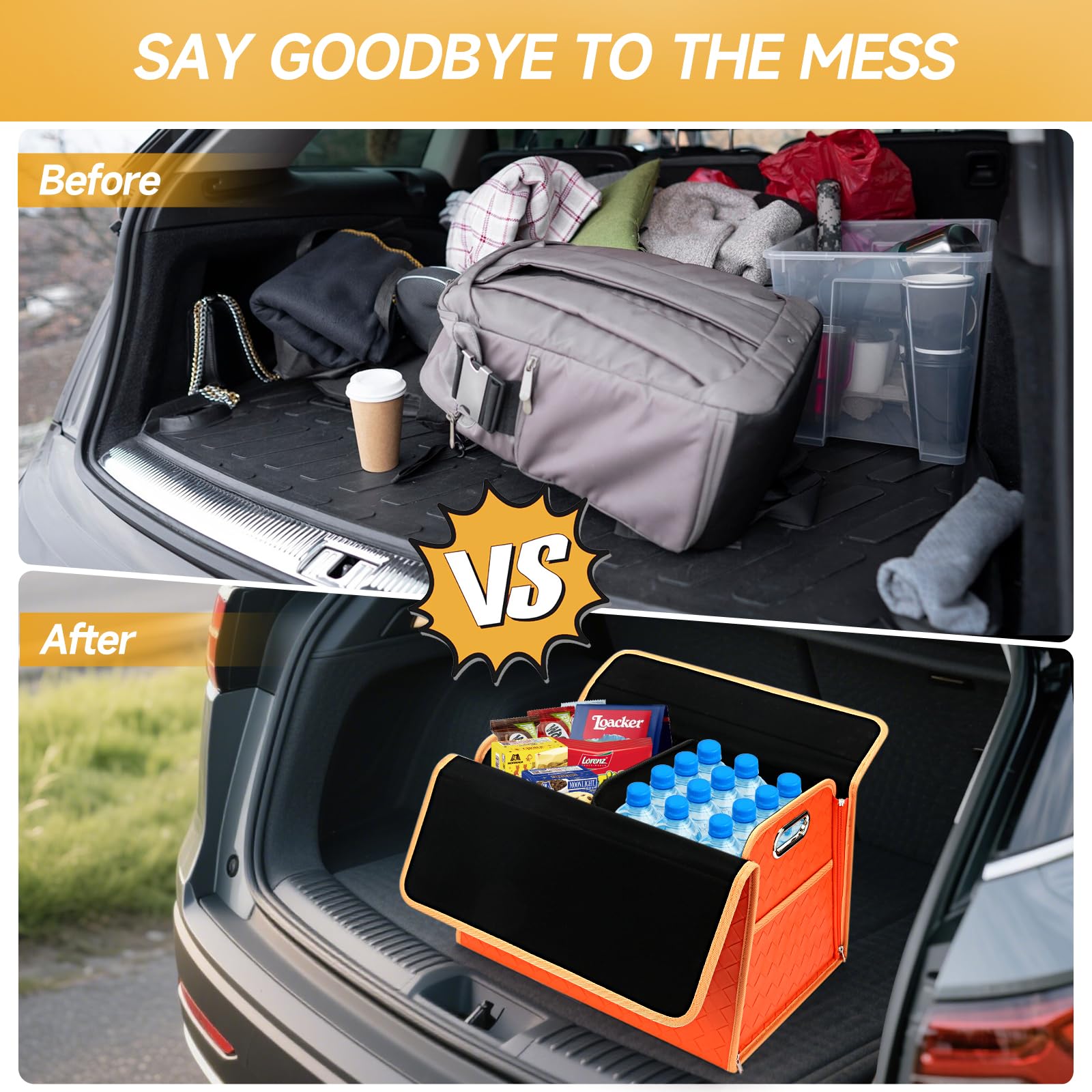 Homeve Trunk Organizer, Waterproof, Collapsible, 2 Compartments Car Organizer, Foldable Storage for Car Accessories, Tools, Women, Men (Orange, Standard)