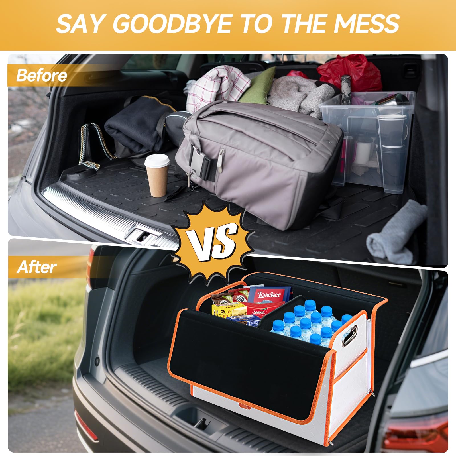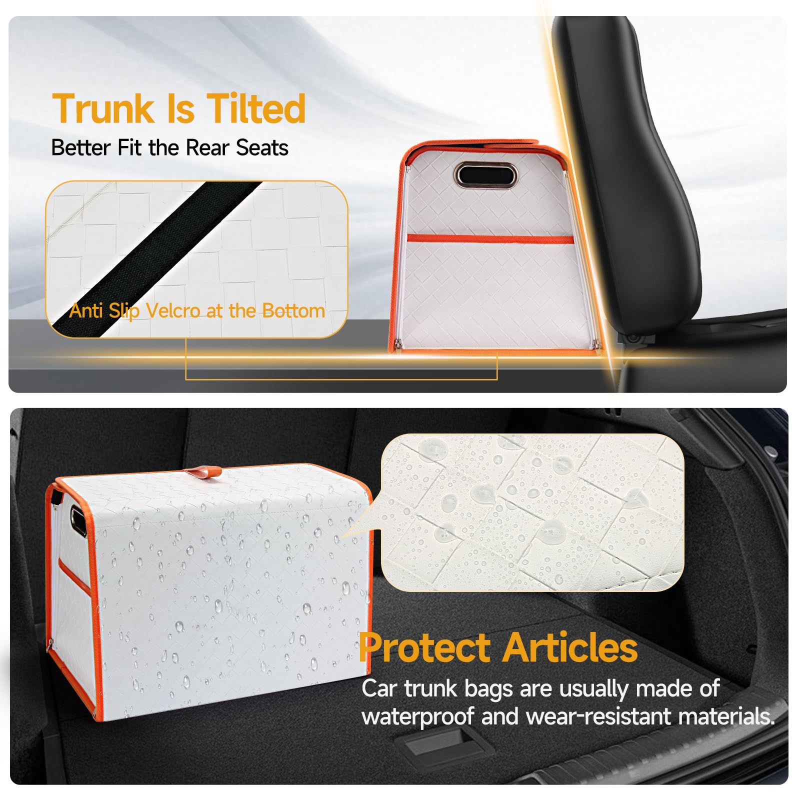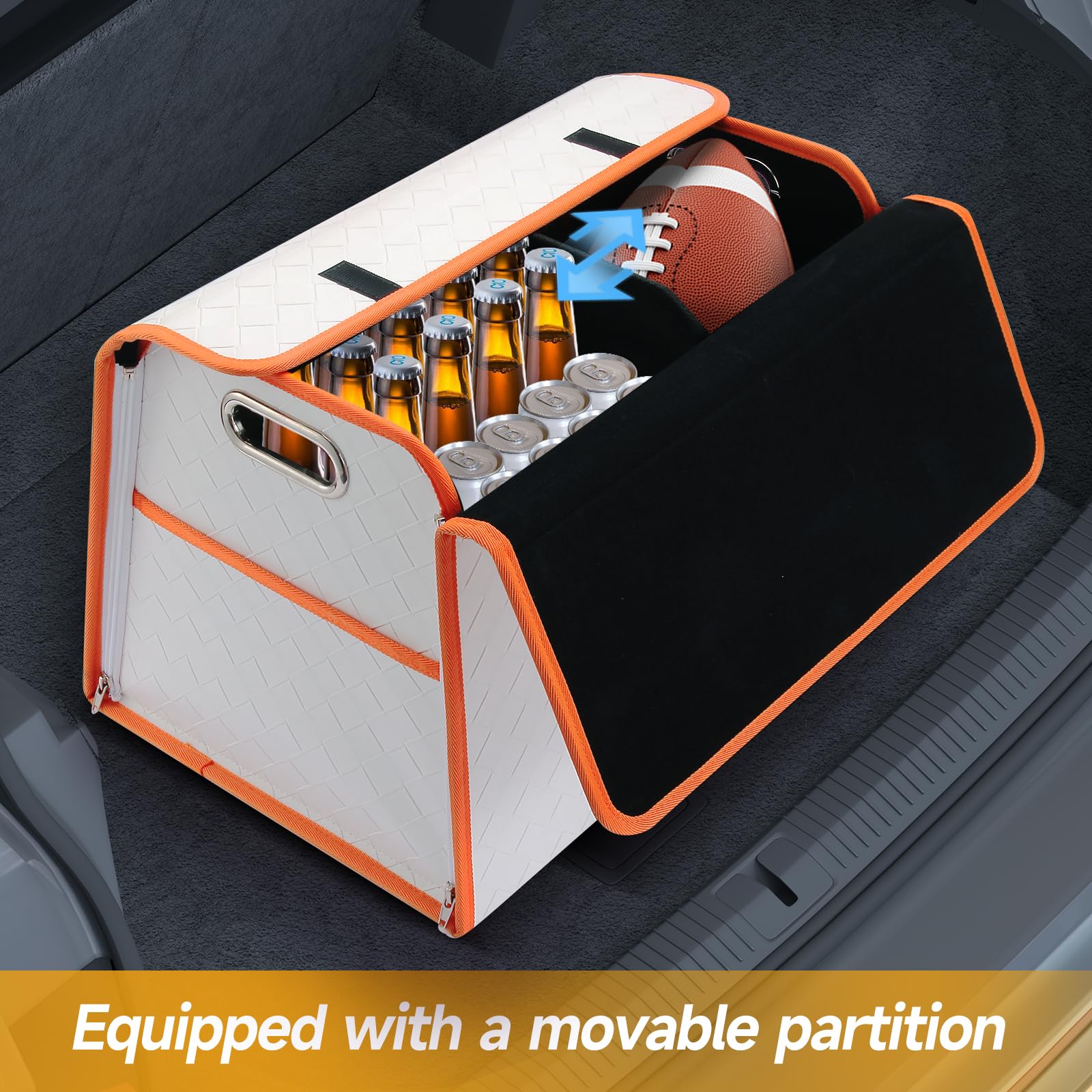 Homeve Trunk Organizer, Waterproof, Collapsible, 2 Compartments Car Organizer, Foldable Storage for Car Accessories, Tools, Women, Men (White Orange, Standard)