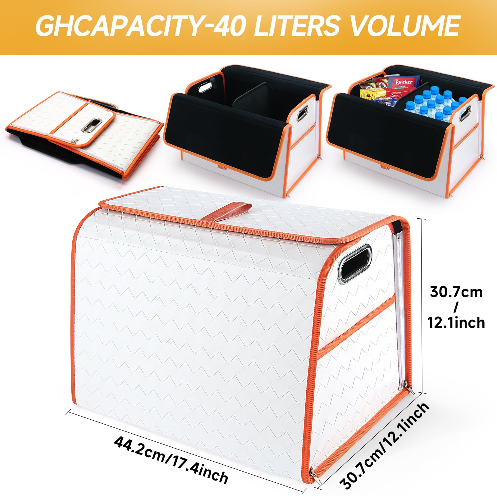 • [Large Capacity] The size of car organizer and storage space is 17.4x 12.1x12.1 inches (length x width x height), It not only has a large capacity, but can also be expanded and molded to store various items. It can be folded into thin sheets, occupying very little space.Creative Zipper design, easy to switch, full of a sense of luxury